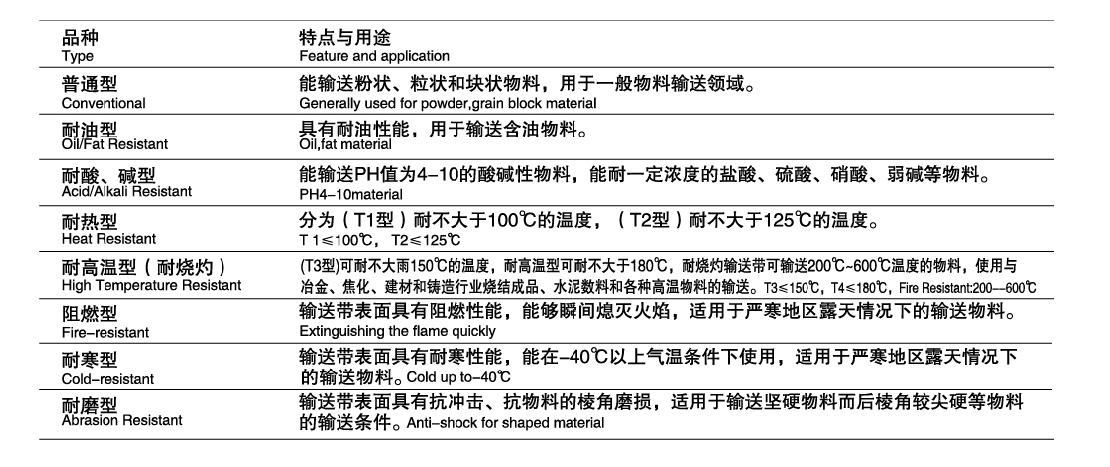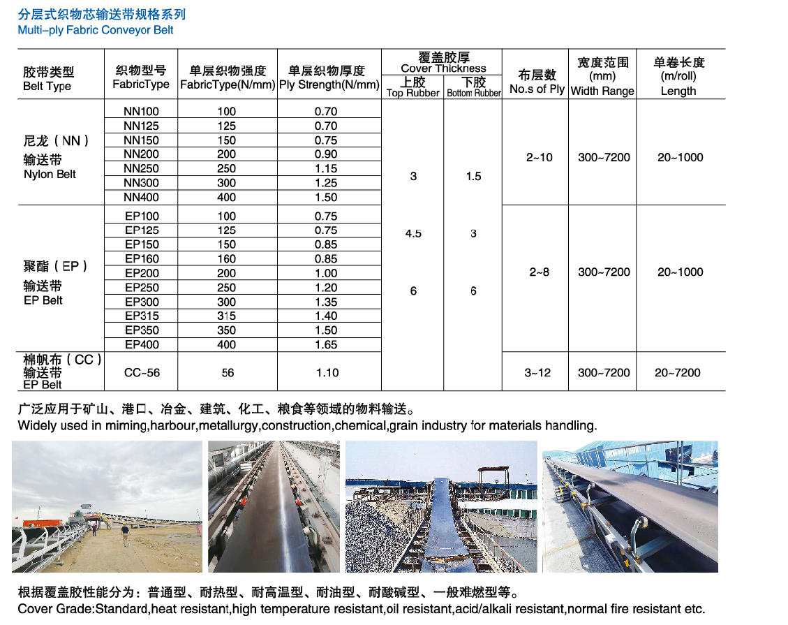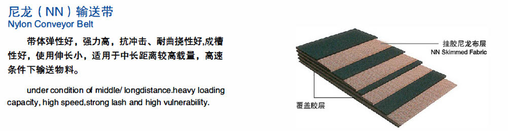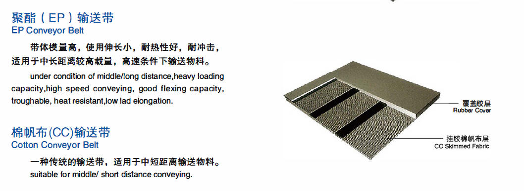 织物芯输送带按抗拉层材料不同分为:棉帆布 (CC) 输送带、 尼龙 (NN) 输送带、 聚酷 (EP) 输送带