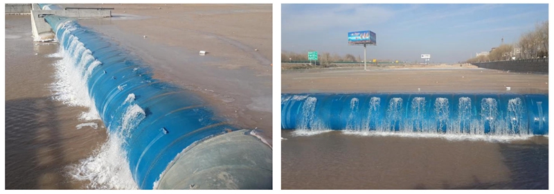 由于河流流量流速的多变状态、坝溢出流量、坝下游尾水等原因,橡胶坝可能整体震动,这需要用扰流板解决。在水漫过坝时,扰流板往坝下渗气减少坝下游负压,从而减少橡胶坝曩体震动,使坝袋保持稳定。